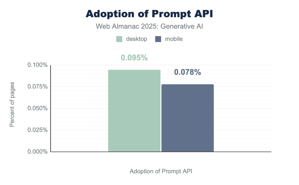 They have achieved the widest adoption of the Built-in AI APIs. The July 2025 HTTP Archive crawl detected the Translator API on 0.277% of all desktop sites and 0.262% of all mobile sites, with the Language Detector API used on just 0.001% fewer sites.