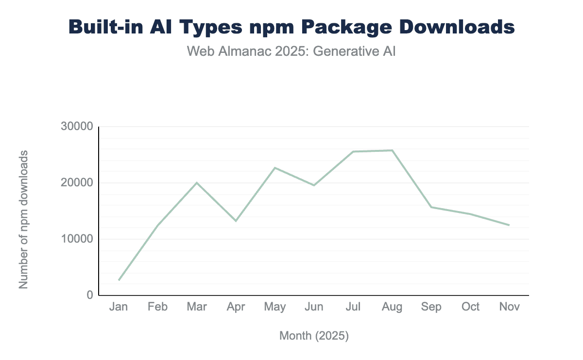 The download numbers of the @types/dom-chromium-ai package, containing TypeScript typings for Built-in AI, may reflect the experimental status of the APIs: Downloads peaked in August 2025 with 25,770 downloads, followed by a gradual decline. This trend may suggest that developers are hesitant to adopt experimental APIs. However, the download statistics for a typings package may not reflect the actual usage of the API.