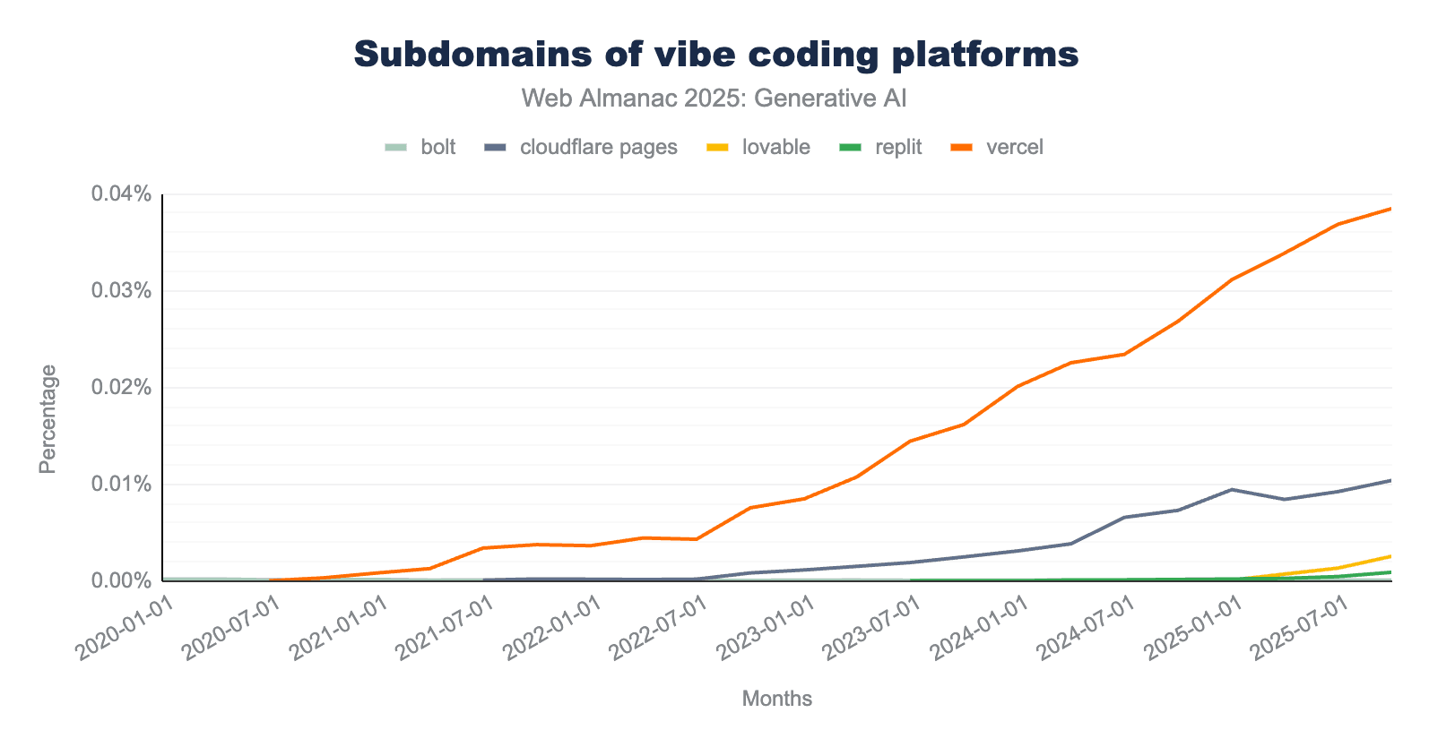 The chart above illustrates the relative growth of vibe coding platform subdomains within the HTTP Archive dataset. While Vercel (*.vercel.app) remains the dominant provider, it has offered subdomain hosting long before the release of its vibe coding tool v0 (*.v0.dev) in late 2023. The data showed no immediate surge following the launch of v0. Lovable (*.lovable.app and *.lovable.dev) grew from only 10 subdomains at the beginning of 2025 to 315 by October 2025. Please note that this only includes pages available in the dataset. According to Lovable, 100,000 new projects are built on Lovable every single day.