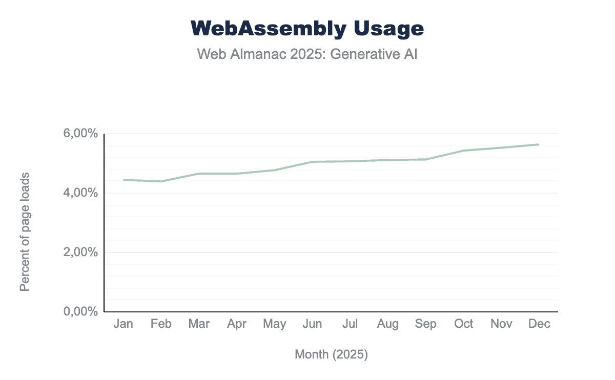 According to Chrome Platform Status data, the usage of WebAssembly experienced 27% linear growth from being active on 4.44% of page loads in January 2025, and 5.64% in December 2025. In January 2024, WebAssembly was only active during 3.37% of page loads.