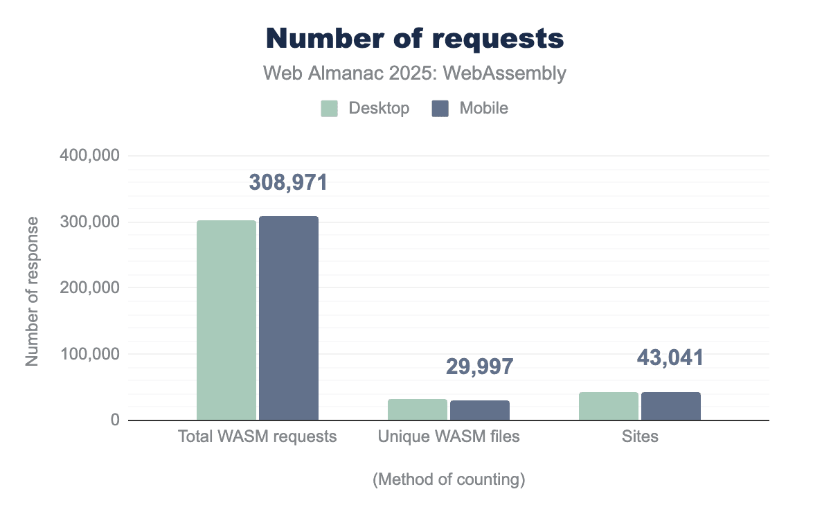 There are over 300,000 wasm requests in our dataset, which come down to 32,197 unique wasm file requests on desktop and 29,997 on mobile. The large number of requests shows many sites are requesting multiple (hundreds in come cases!) WASM files.